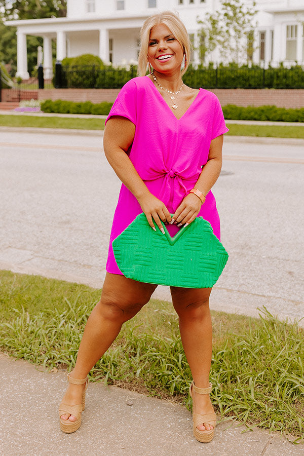 Show off how classy and confident you are in this adorable fuchsia colored plus size romper featuring lightweight material, a v-cut neckline, short sleeves, a cinched waistline with a tie belt, an open back with a button closure, and a relaxed shorts silhouette that ends in a straight mid-thigh length hemline!