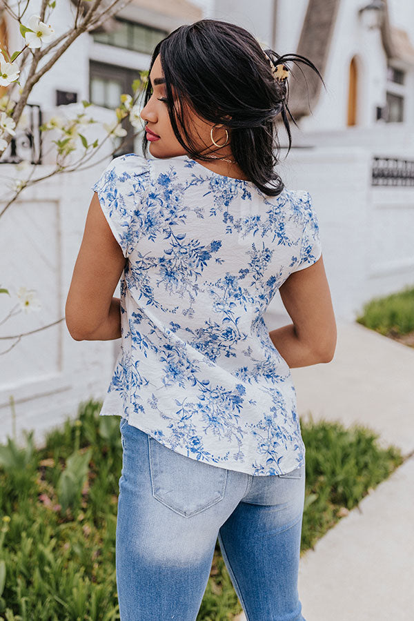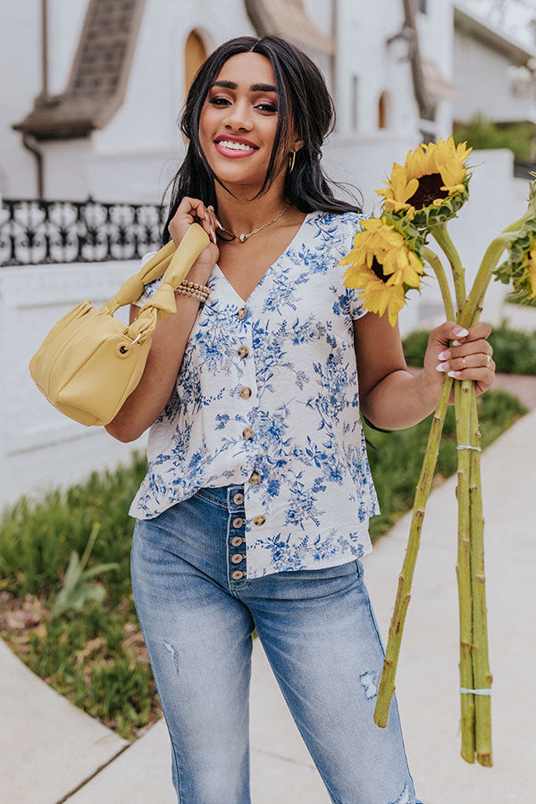 You won't be feeling blue in our gorgeous white 'Coastal Calling' top featuring lightweight material patterned with a blue floral print, a button down front with a v-cut neckline, short sleeves, and a flattering silhouette that falls into a straight hemline! Measurements