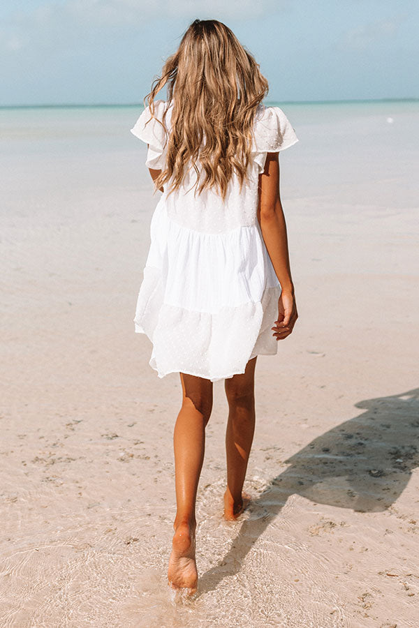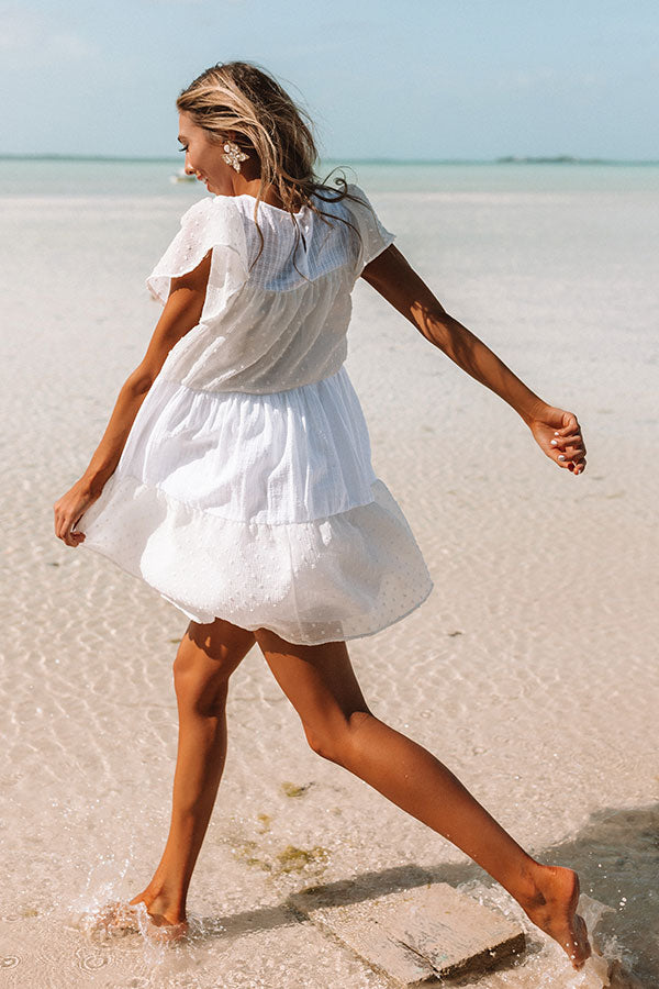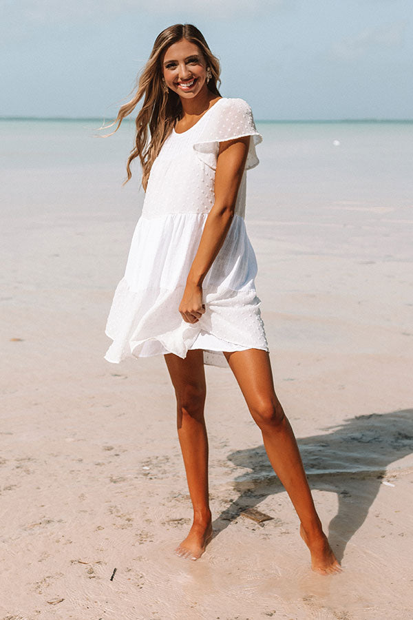 Keep it simple our elegant white "Cosmos And Kisses" shift dress featuring lightweight breezy layered material patterned with subtle polka dot and checkered texturing, a high rounded neckline, short loose flounced sleeves, a keyhole accented upper back with a button closure, and an ultra relaxed tiered silhouette that falls into an uneven mid-thigh length hemline! You can style this charming piece a variety of ways, like with a neutral platform heel and statement earrings, but you can also wear it with "The Lyla Sandal in Red," our "Mimosa Party Cat Eye Sunnies in Red," and our "First Class Forever Quilted Crossbody in Red!" Measurements
