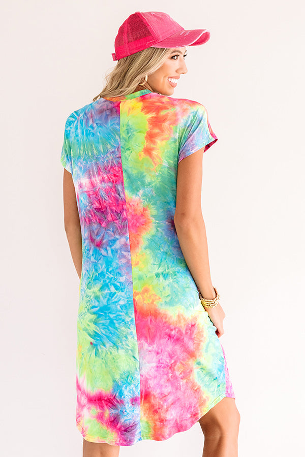 You are sure to catch someone's attention when you wear this vibrant dress featuring soft lightweight material patterned with rainbow tie dye, a v-cut neckline, short loose sleeves, accent side pockets, and a relaxed silhouette that falls into a rounded knee-length hemline! We have styled this festive piece with some neutral wedges and a matching baseball cap, but you can also wear it layered under a white jean jacket with "The Ariella Heel in Hot Pink" and our "Amalfi Adventure Woven Tote in Hot Pink!"