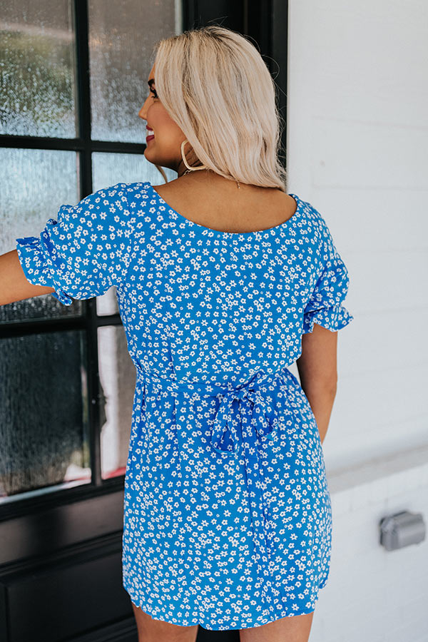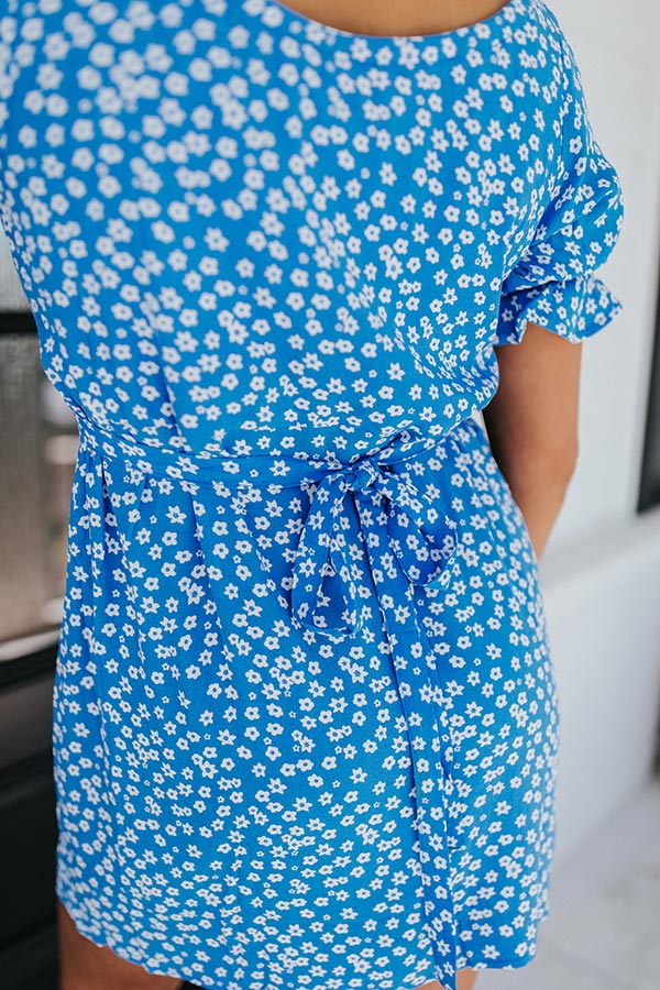 You are guaranteed to look divine in this darling blue dress featuring lightweight material patterned with a small white floral print, a scooped neckline, short puff sleeves with ruffled cuffs, an accent tie back, and a flattering silhouette that ends in a straight upper-thigh length hemline! Measurements
