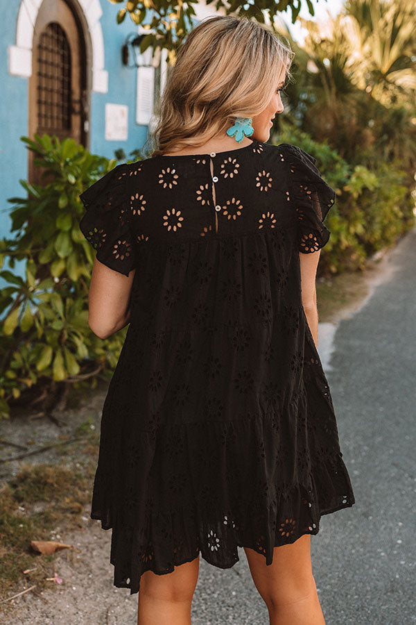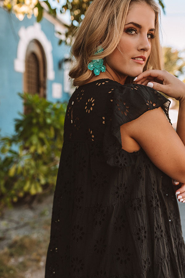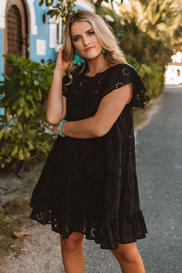 We know, we know, it's easy to get excited over this adorable little black shift dress featuring lightweight breeze material with intricate floral eyelet detailing, a high rounded neckline, short ruffled sleeves, a two button closure back, and an ultra relaxed silhouette that falls into an uneven mid-thigh length hemline! You can style this charming piece a variety of ways, like with a cheetah print wedge and turquoise statement jewelry, but you can also wear it with "The Lyla Sandal in Red," our "Mimosa Party Cat Eye Sunnies in Red," and our "First Class Forever Quilted Crossbody!" Measurements