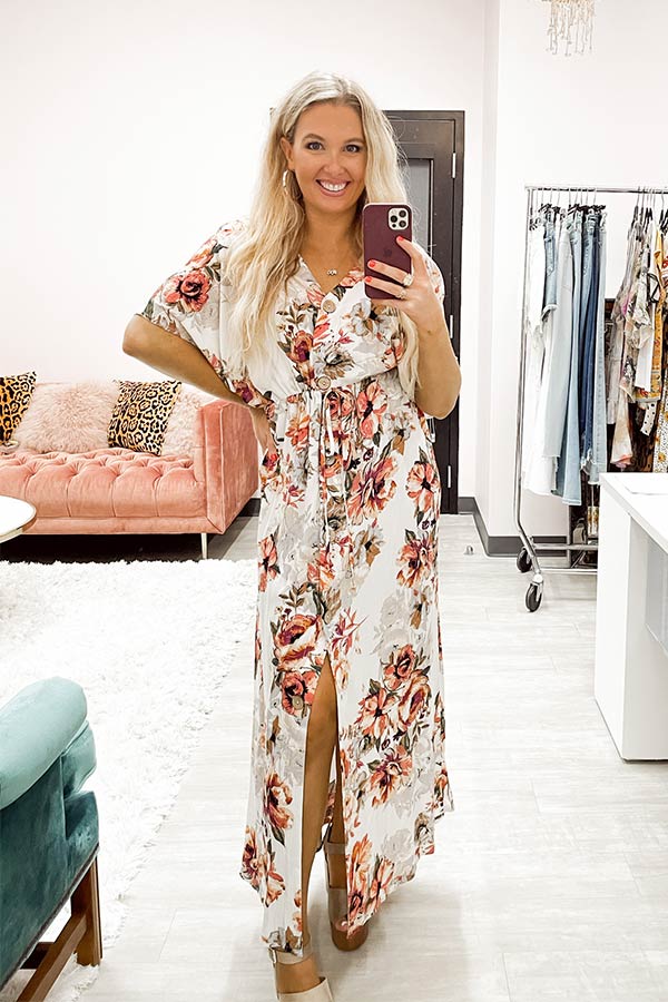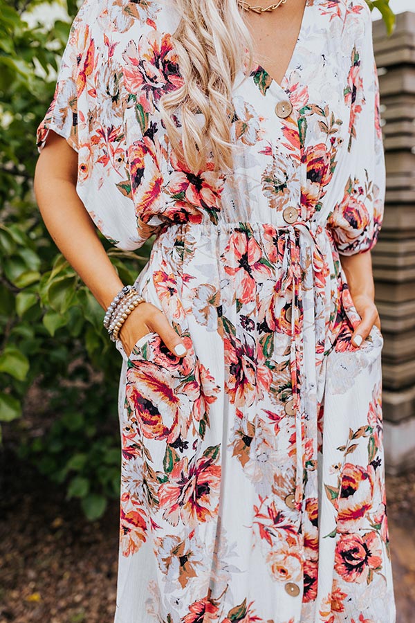 Your look is sure to bloom when you wear our charming white 'Every Second Counts' maxi dress featuring lightweight flowy material patterned with a bold coral hued floral print, a button down front with a v-cut neckline, a cinched waistline with a tie belt, loose half sleeves, hidden side pockets, and a relaxed silhouette that cascades into a straight ankle-length hemline! Measurements