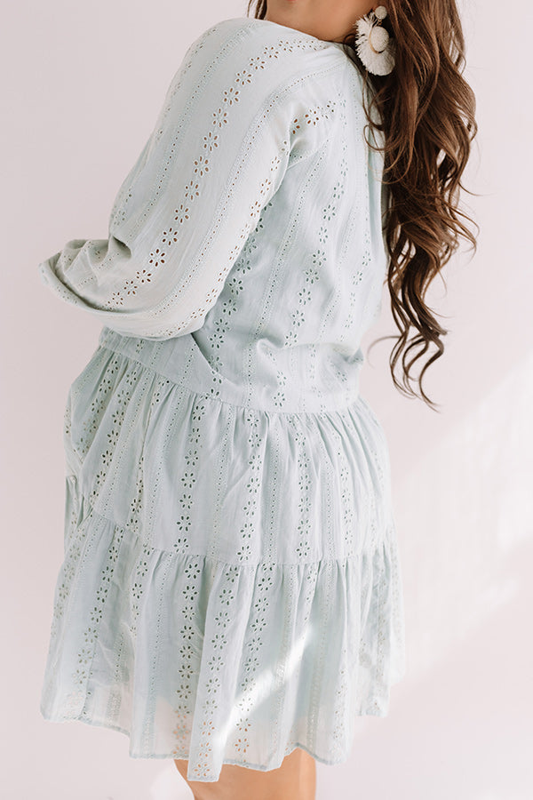 Plus Size - Slip on our pear colored "Excited For Paradise" dress and slip into vacay mode with its lightweight breezy material with intricate eyelet striped detailing, a v-cut neckline with a tie closure, loose bishop sleeves with fitted cuffs, and a relaxed tiered silhouette that falls into an uneven mid-thigh length hemline! We have styled this charming piece with neutral platform heels and an ivory crossbody and statement earring, but you can also wear it with "The Sydney Wedge in Gold" and our "Cute As Can Be Clutch in Gold!" Measurements