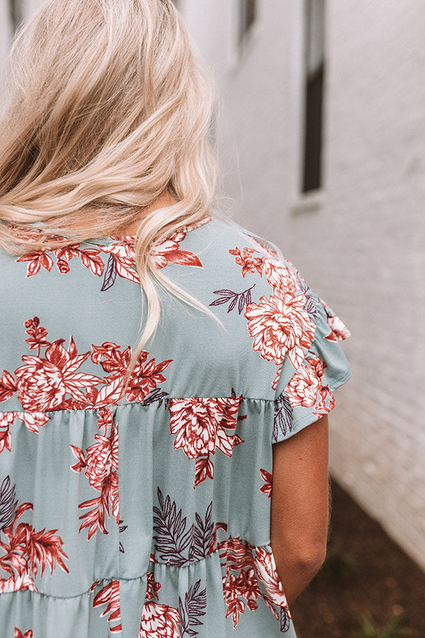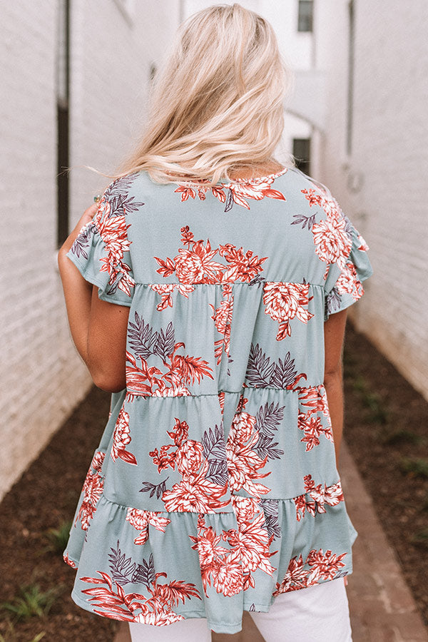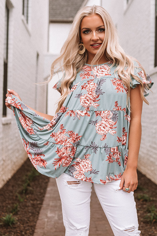You are sure to look "fleur fabulous" when you wear this adorable sage colored top featuring soft lightweight material patterned with a vibrant rust hued floral print, a high rounded neckline, short loose sleeves with ruffled cuffs, and a relaxed tiered babydoll silhouette that falls into an uneven tunic length hemline! We have styled this blossoming cutie with some distressed white skinnies and neutral wedges, but you can also wear it with some frayed denim shorts, "The Lela Espadrille in Coral," and our "All Caught Up Headband in Ivory!" Measurements