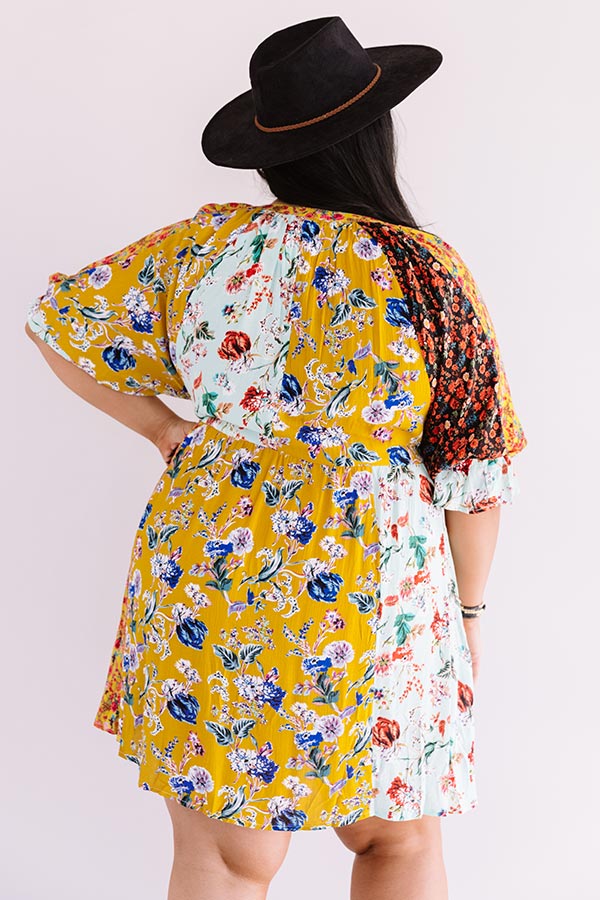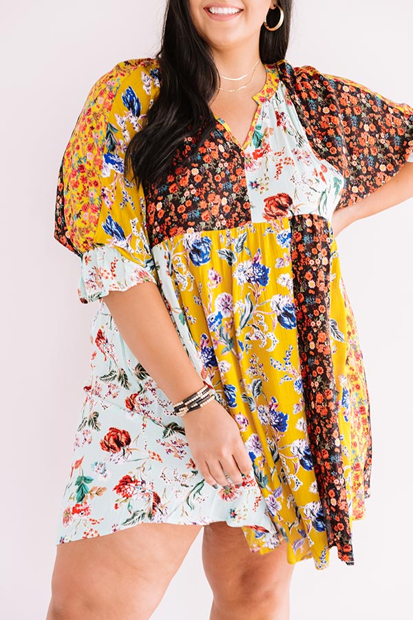 Plus Size - Add a fun piece to your wardrobe with this darling dress featuring lightweight breezy material, colorful and abstract color block floral prints, a v-cut neckline, loose bubble sleeves with ruffled cuffs, and a relaxed babydoll silhouette that falls into an uneven mid-thigh length hemline! Measurements