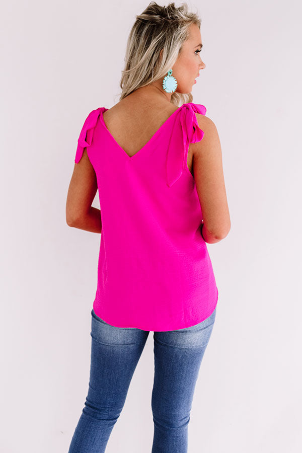 Stay cool this summer in our charming hot pink "Forever Fling Top" featuring lightweight breezy material, a wrapped bodice with a v-cut neckline and upper back, tied 1-inch sleeveless shoulder straps, and a relaxed silhouette that falls into a rounded hemline! We have styled this flirty piece with some distressed ankle skinnies, neutral heels, and a seashell woven clutch, but you can also wear it with some white flares, "The Roxana Wedge in Hot Pink," and our "Sippin' At Sunset Sunnies in White!" Measurements