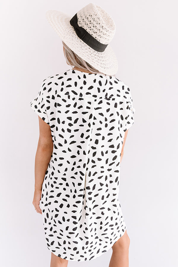 Many people are sure to have a "friendly crush" on you when they see how adorable you look in this ivory colored shift dress featuring lightweight breezy material patterned with a black abstract polka dot print, a v-cut neckline, short loose sleeves with rolled cuffs, accent side pockets, and a relaxed silhouette that falls into a rounded mid-thigh length hemline! We have styled this cutie with a woven hat and a black block heel and crossbody, but you can also wear it layered under a jean jacket with "The Alba Wedge in Ivory!" Measurements
