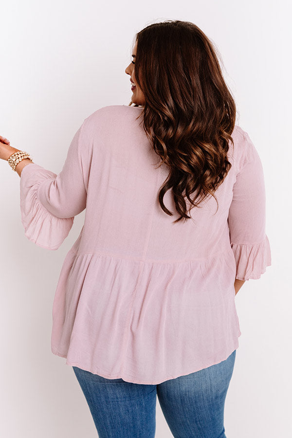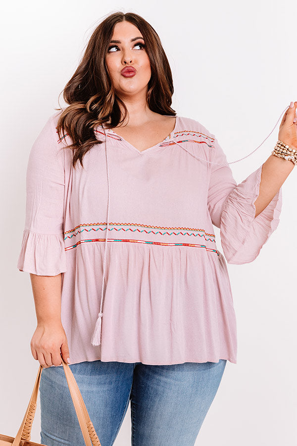 Plus Size - Life's a party, so dress like it in our charming light pink 'Front Porch Party Shift Top' featuring lightweight material with embroidered detailing, a wide v-cut neckline with a tie closure, figure flattering half sleeves with oversized flare cuffs, and a relaxed silhouette that falls into a peplum bottom with an uneven hemline! Measurements