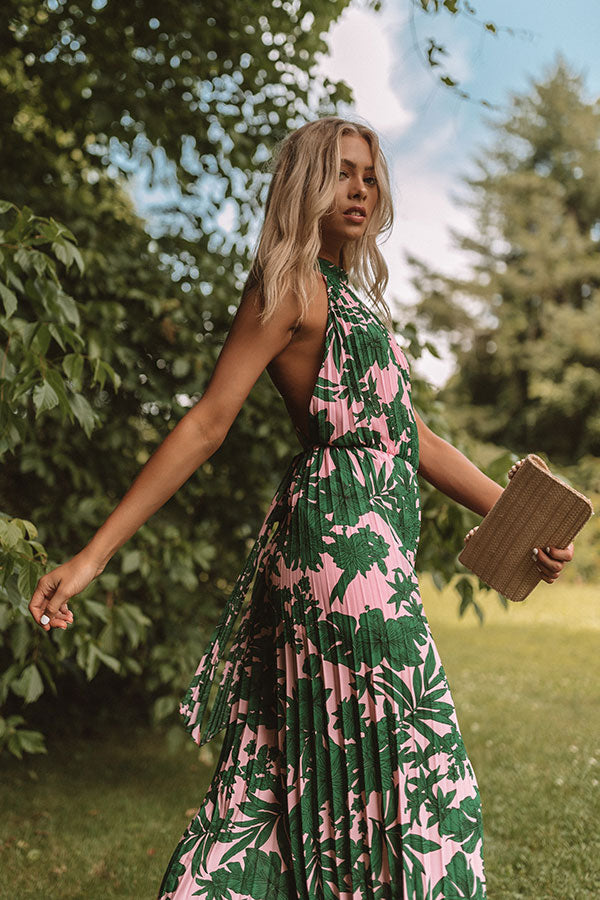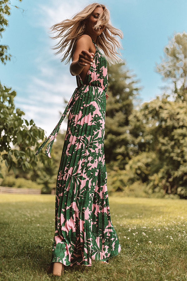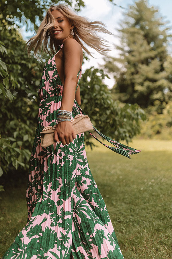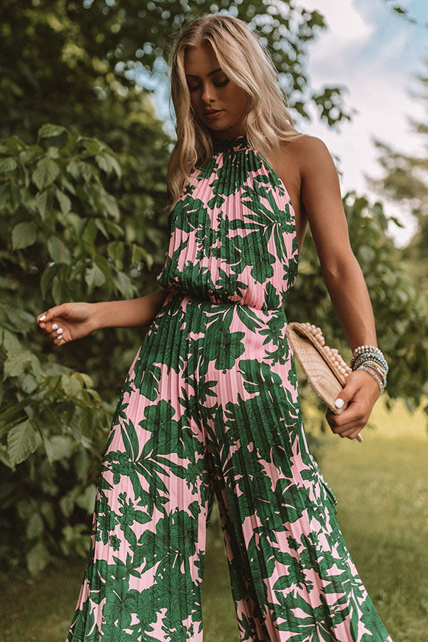 Dress for yourself and no one else in this captivating jumpsuit with its pleated bodice and open back with a zipper and criss-cross tie straps! The emerald tropical pattern pops off the light pink, giving this piece an eye catching appeal that will look stunning when styled with nude heels and a summer clutch! Measurements