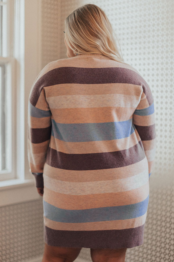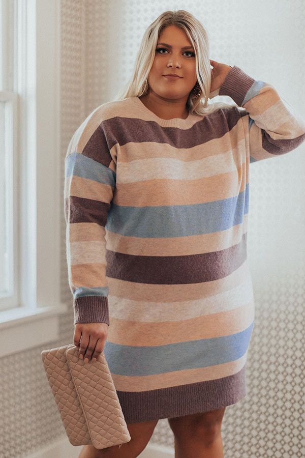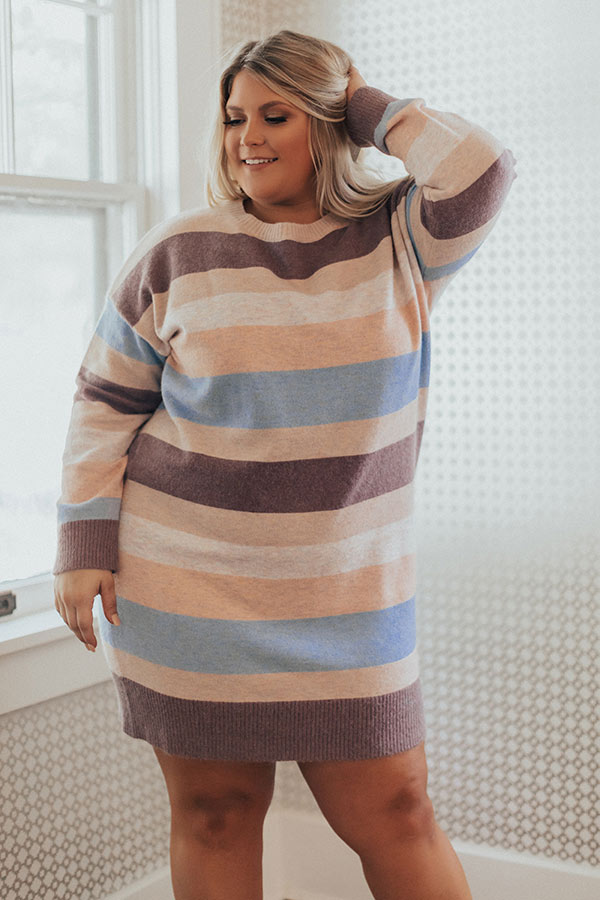 Plus Size - Impress everyone with your good looks and grace with this adorable sweater dress featuring soft lightweight tight knit material with horizontal dusty purple, periwinkle, cream, and light blush accent stripes, a high rounded neckline, long loose sleeves, and a flattering silhouette that falls into a straight mid-thigh length hemline!