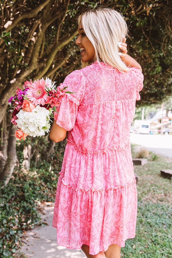This darling pink shift dress is for all you ladies in the place with style and grace with its lightweight breezy material, subtle floral print, high rounded neckline, short loose sleeves, ruffled accent seams, smocked upper back with a zip closure, and ultra relaxed tiered silhouette that falls into an uneven mid-thigh length hemline! We have styled this beauty with some neutral wedges, but you can also wear it with "The Melina Faux Leather Heel in White" and our "City Chic Faux Leather Tote in White!" Measurements