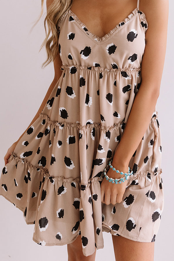 Go wild in our adorable iced latte colored "Hamptons Hideout" dress featuring lightweight breezy material patterned with a bold black and white leopard print, a v-cut neckline with adjustable spaghetti straps, a low open back with a tie closure, ruffled seam and trim detailing, and a relaxed tiered babydoll silhouette that falls into an uneven mid-thigh length hemline! We have styled this gorgeous piece with black wedges and sunnies, but you can also wear it layered under a distressed denim jacket with "The Jess Faux Suede Heel in Natural" and our "Champagne And Chic Faux Leather Clutch in Black!" Measurements