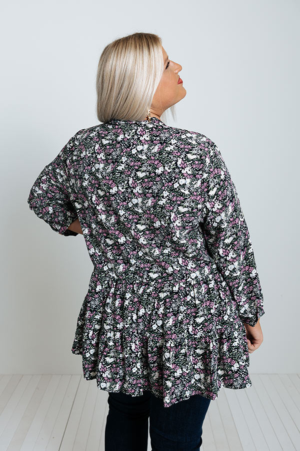 Let your fall style blossom with our charming black plus size 'Happy Environment' top featuring lightweight flowy material patterned with a pink, green, and white floral print, a button down front with a v-cut neckline, 3/4-length bubble sleeves, and a relaxed silhouette that falls into a flattering peplum hemline!