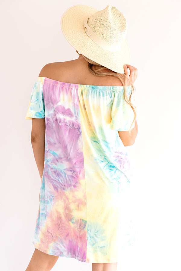 Liven up your summer wardrobe with our darling "Happy For You Tie Dye Dress" featuring soft lightweight breezy material patterned with colorful tie dye, a straight elastic off-shoulder neckline with short drop sleeves, and a relaxed silhouette that falls into a straight lower-thigh length hemline! We have styled this cutie with a woven block heel, clutch, and hat, but you can also wear it with the "Steve Madden Travel Stud Sandal in Clear" and our "Relaxing Poolside Sunnies in Purple!"