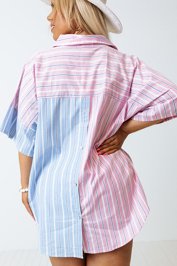 People's hearts are sure to skip a beat when you arrive looking amazing in this adorable plus size top featuring lightweight material, baby pink and sky blue color block halves with vertical accent stripes, a collared v-cut neckline, loose short sleeves, a single accent chest pocket, a button down back, and a slouched silhouette that falls into a rounded hemline!