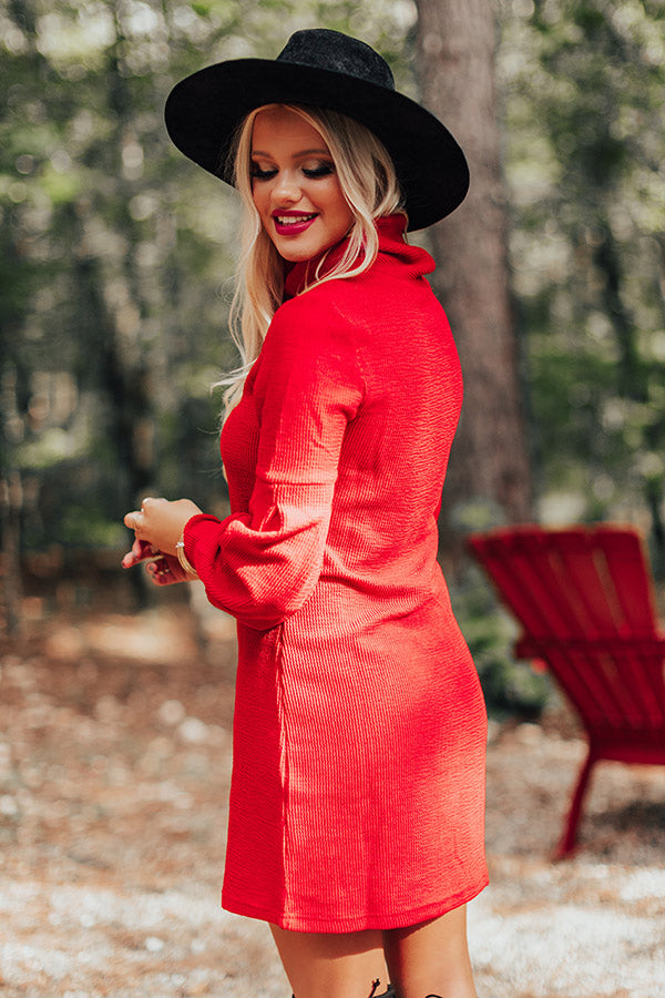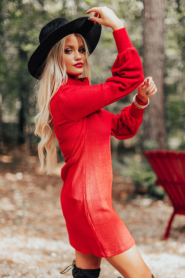Dress to impress in our darling red hot "Hey Pumpkin" dress featuring soft lightweight tight knit material with ribbed texturing, a high turtle neckline, long sleeves with bubble forearms and fitted cuffs, and a relaxed silhouette that falls into a straight mid-thigh length hemline! Measurements