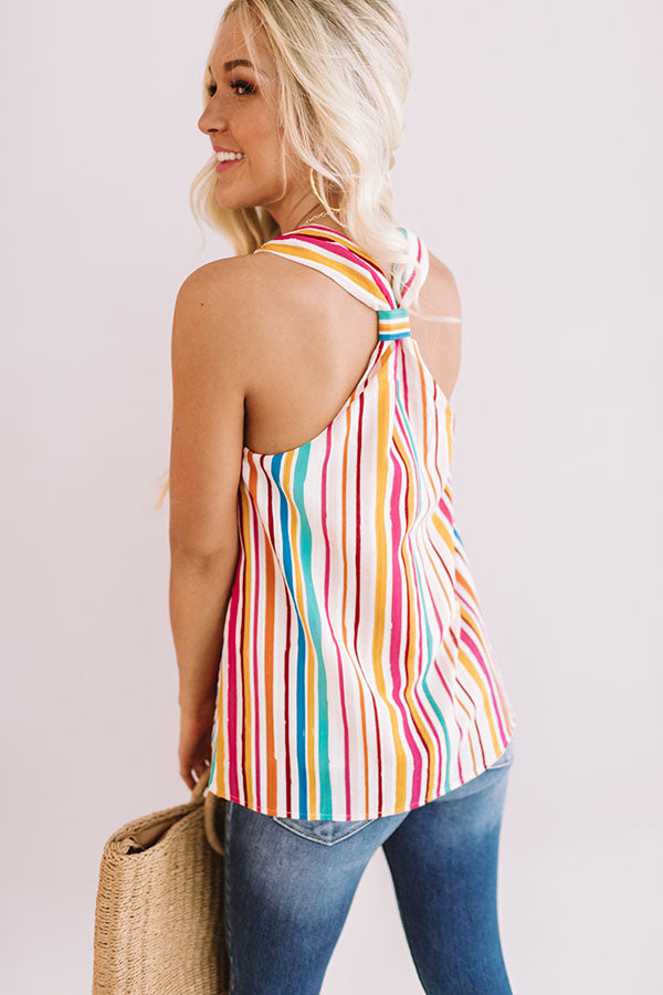 "Stripe" a pose in this "jetset staple" with its colorful stripes and racer back! This vibrant piece pairs perfectly with frayed jeans, a nude wedge, and a straw tote for a summer day look or style it with a white heel, our "Santorini Sunshine Trousers in Mustard" and white "Right On Track Blazer" for a lively girl boss look! Measurements