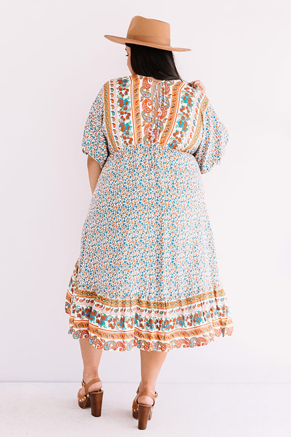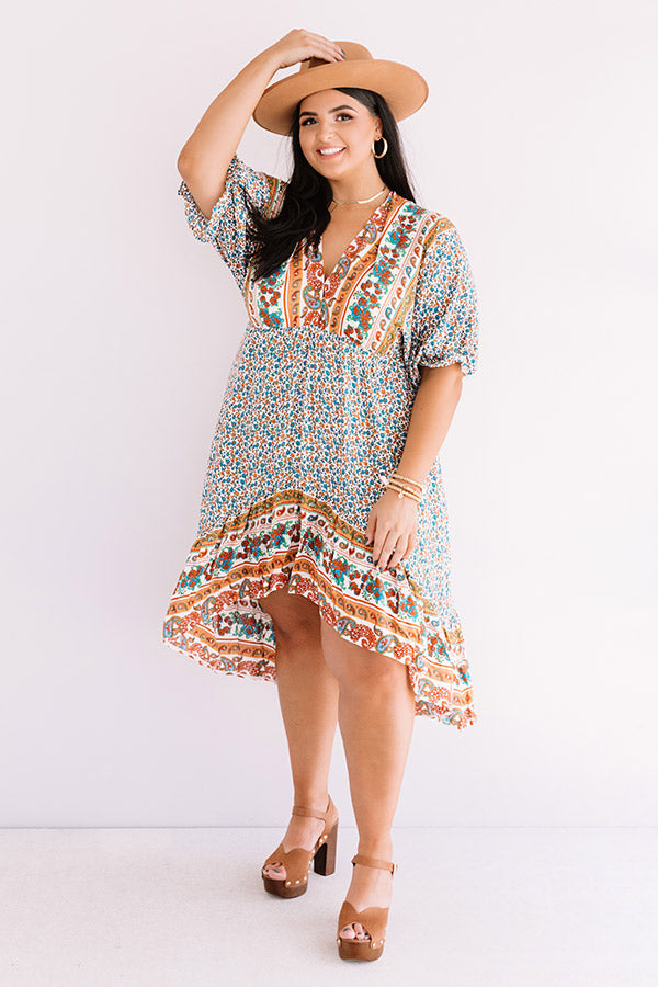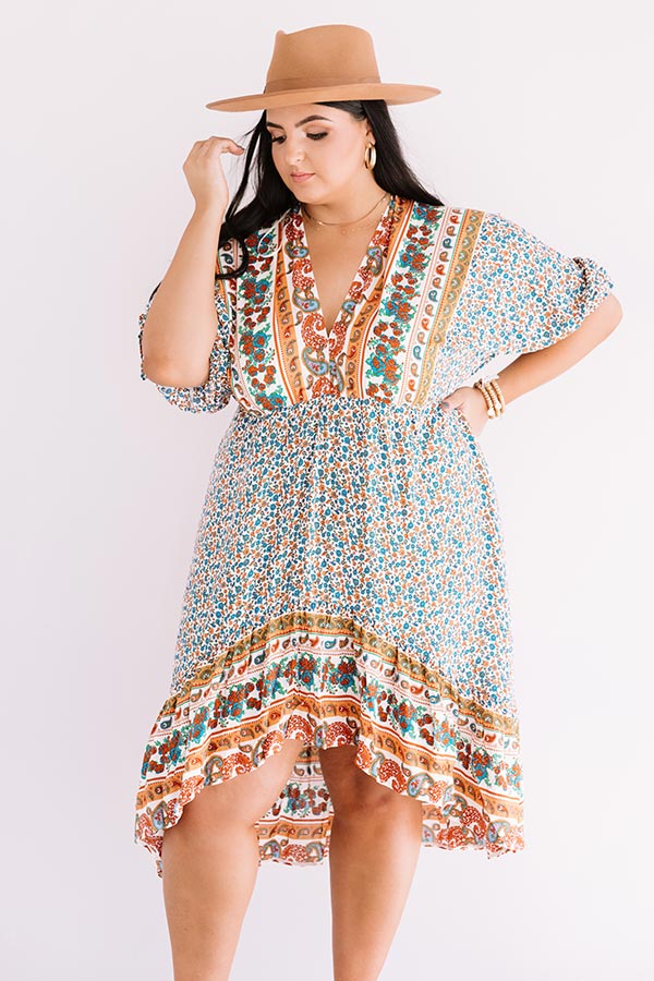 Plus Size - Hit the road in style with our stunning 'Journey To Tahoe' dress featuring lightweight breezy material patterned with a variety of mustard and turquoise hued floral patterns, a v-cut neckline and upper back with a tie closure, short loose bubble sleeves with elastic cuffs, and a relaxed babydoll silhouette that falls into an uneven knee-length hemline!
