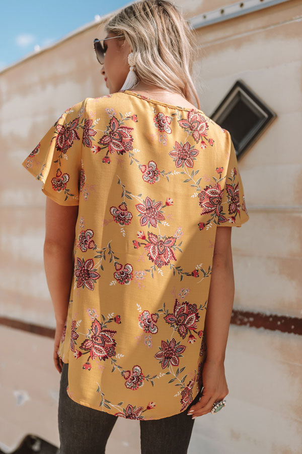 This short-sleeved, breezy piece takes the summer t-shirt to the next level! The dark purple floral print pops against the light yellow fabric and the chest is detailed with elastic stitching, helping the shirt fit your shoulders perfectly, while still allowing the shirt to flow beautifully! Measurements