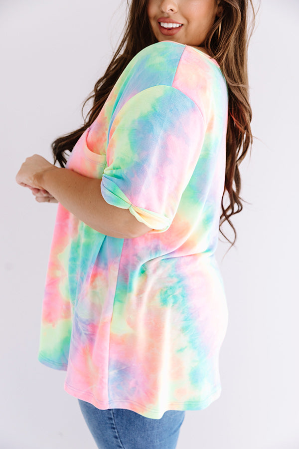 Plus Size - Steal the show with our vibrant "Mai Tai Time" tee featuring soft lightweight material patterned with neon pink, blue, yellow, and green tie dye, a scooped neckline that can be worn off one shoulder, short loose sleeves with tolled cuffs, an accent chest pocket, and a relaxed silhouette that falls into a rounded hemline that can be knotted! We have styled this summer cutie with some frayed ankle skinnies, matching sunnies, and neutral wedges, but you can also wear it with some distressed white shorts, clear sandals, and a transparent crossbody! Measurements