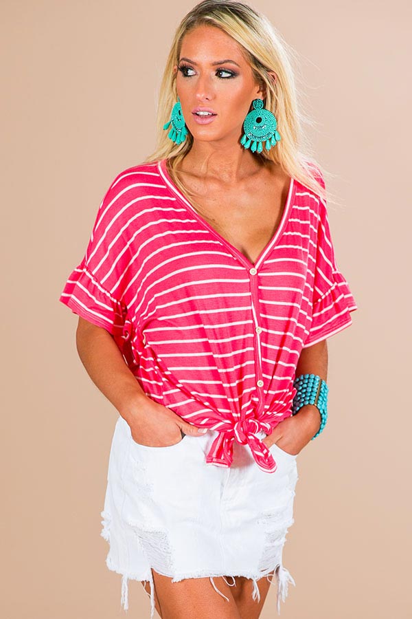 The "Margarita Stripe Shift Top" is STRIPE up our alley! This striped shift top has short flounced sleeves, a faux button-down bodice & a trendy tie bottom hem. Style with your favorite denim & a colorful statement accessory, for a "casual cute" look that you will wear time & time again! - Machine wash cold. Tumble dry low. - Unlined, but not see through.
