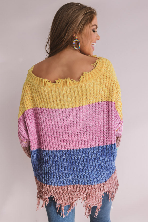 Brighten up any gloomy winter day with our vibrant "Matters Of The Heart" sweater featuring ultra soft lightweight tight knit chenille material with ribbed texturing, distressed trim detailing, wide horizontal color block accent stripes, long loose sleeves, and a relaxed silhouette that falls into an uneven hemline! We have styled this bright cold weather cutie with some distressed ankle skinnies and neutral booties, but you can also wear it with some charcoal flares, "The Scout Faux Leather Peep Toe Wedge in Stone," our "All Caught Up Headband in Ivory," and our white "Right On Cue Fringe Crossbody!"