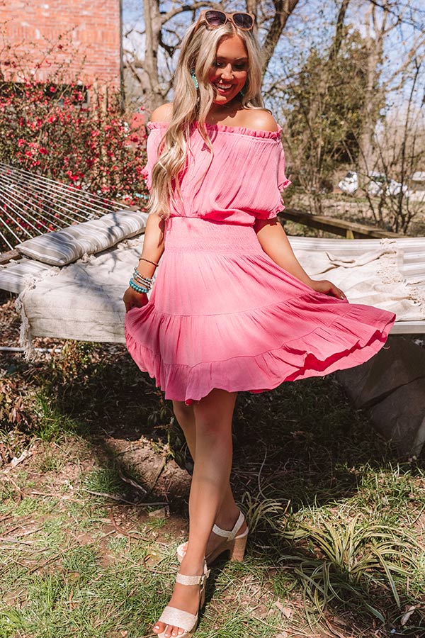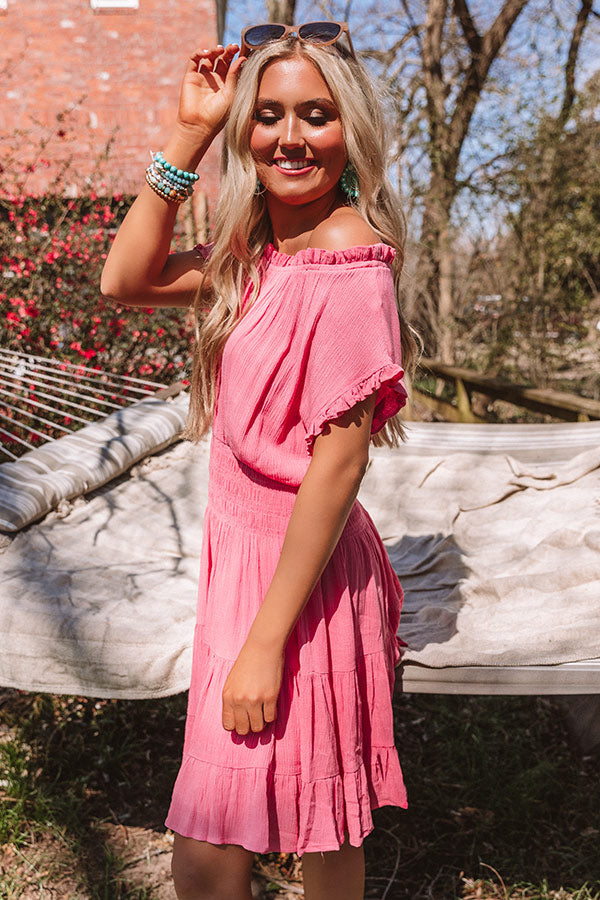 You will no doubt have an incredible style moment when you wear this beautiful pink dress featuring lightweight breezy material, an off-the-shoulder fit with short drop sleeves, a straight elastic neckline with ruffled trim detailing, a smocked figure flattering waistline, and a relaxed tiered skirt silhouette that falls into an uneven mid-thigh length hemline! We have styled this cutie with some turquoise accent jewelry, sunnies, and woven block heels, but you can also wear it with "The Lilianna Faux Suede Wedge in Iced Latte" and our "Bryant Park Views Quilted Crossbody in Iced Latte!"
