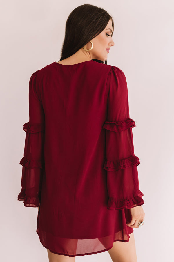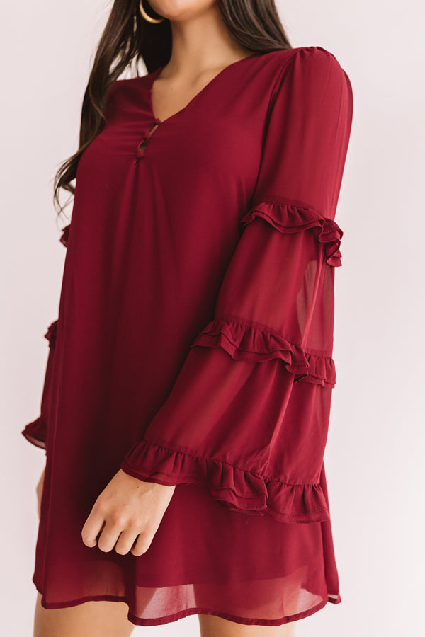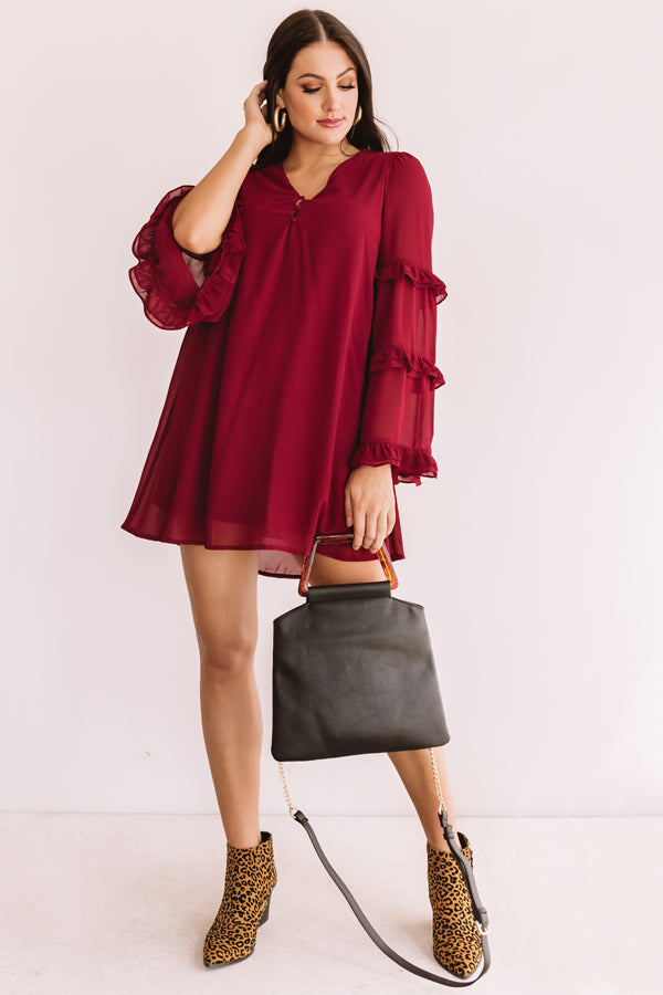 This merlot colored shift dress is perfect for wearing to all those "nights at the vineyard" with its lightweight fully lined material, button up bodice with a v-cut neckline, long flared sleeves with ruffled tiers, and an ultra relaxed silhouette that cascades into a mid-thigh length straight hemline! This beautiful fall piece styles gorgeously with a leopard bootie and a black tote, or with grey accents like "The Seraphina Faux Leather Wedge" and our "Champagne Nights Tassel Earrings" for the ultimate wine tasting and dinner look! Measurements