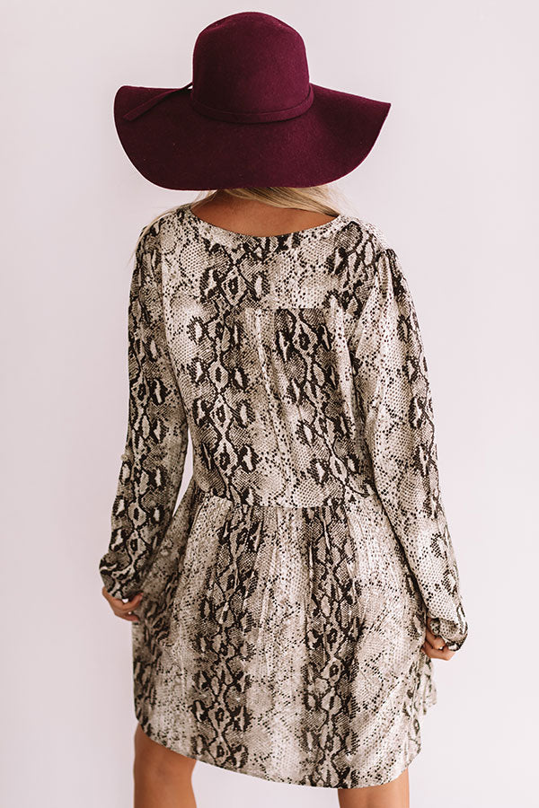 We think this shift dress is the ideal piece to wear when taking in all those "NYC sights" with its snake print pattern, lightweight material, v-neck, long sleeves, and breezy babydoll skirt! This striking piece can be accessorized multiple different ways like with black peep toed block heels and a maroon crossbody and faux suede hat, or it can be styled with "The Haven Faux Suede Knee High Boot in Black" and our "All Caught Up Headband in Black" for multiple street style outfits that are sure to turn heads! Measurements