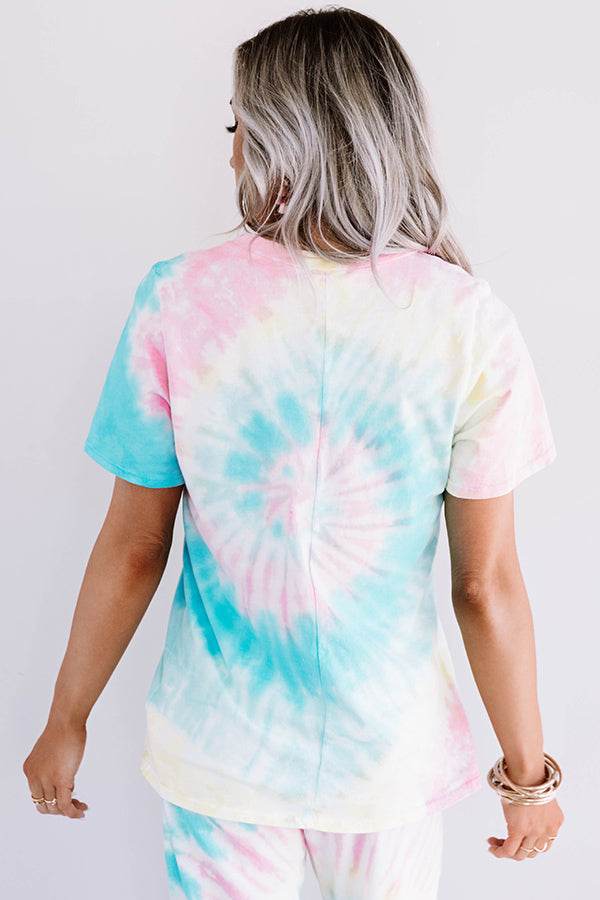 Relax in luxury with our adorable "Oceanside Dreaming" tee featuring soft lightweight material patterned with blue, pink, and yellow hued tie dye, a high rounded neckline, short loose sleeves, and a relaxed silhouette that falls into a straight hemline that can be knotted! This comfy piece styles perfectly with our matching "Oceanside Dreaming Tie Dye Joggers," a scrunchie, and some fuzzy slippers for the ultimate two-piece lounge look! Measurements