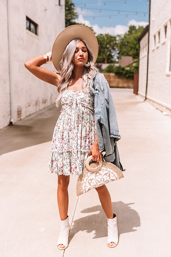 Stroll into any occasion in style with this darling cream hued dress featuring lightweight breezy material patterned with a small colorful floral print, an straight off-shoulder neckline with ruffled accent trim, a tie detail on the bodice, and a relaxed babydoll silhouette that falls into a peplum bottom with an uneven mid-thigh length hemline! This adorable piece layers perfectly under a jean jacket with a woven clutch and a matching wedged bootie and a wool hat, but you can also wear it with "The Parker Faux Suede Lace Up Heel in Scarlet!" Measurements
