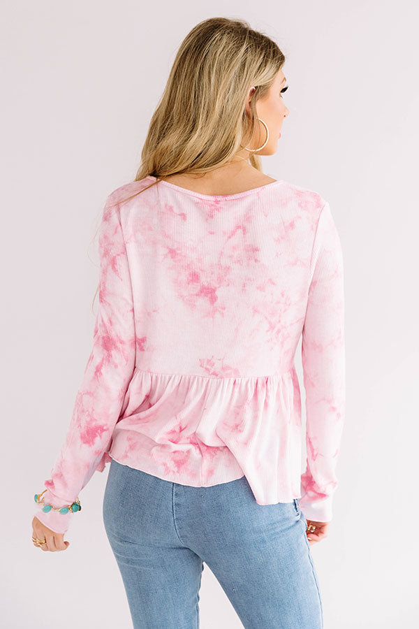 Oui Oui! We LOVE this adorable top featuring soft lightweight material patterned with pink and white tie dye and subtle ribbed texturing, a v-cut neckline, long form fitting sleeves, and a relaxed babydoll silhouette that falls into a peplum bottom with an uneven hemline! We have styled this cutie with some light wash flares and a white heel and bucket bag, but you can also wear it with some distressed white shorts, "The Bowen Wedge in Blush," and our "Sippin' At Sunset Sunnies in White!"