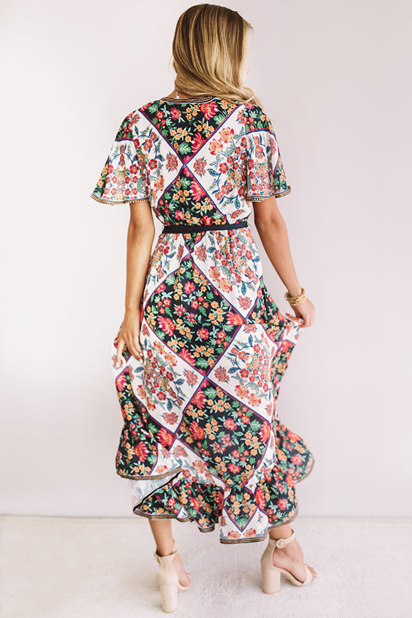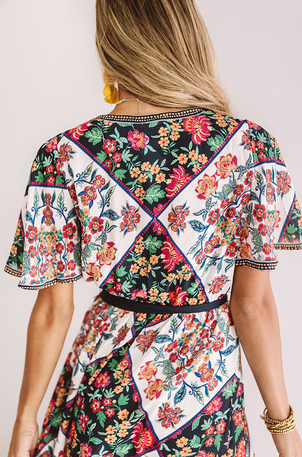 This floral dress is the epitome of a casual but eye-catching summer piece with its v-neck, flowy sleeves, elastic waistband with a tie belt, and uneven hem with a ruffled trim! This brilliant piece can be paired with simple nude heels and a straw tote or with matching navy shoes like our "Vacation Friendly Wedge," then for a pop of color, accessorize with our "Bright On Point Clutch in Orange," making this the perfect outfit for Prosecco on the patio! Measurements