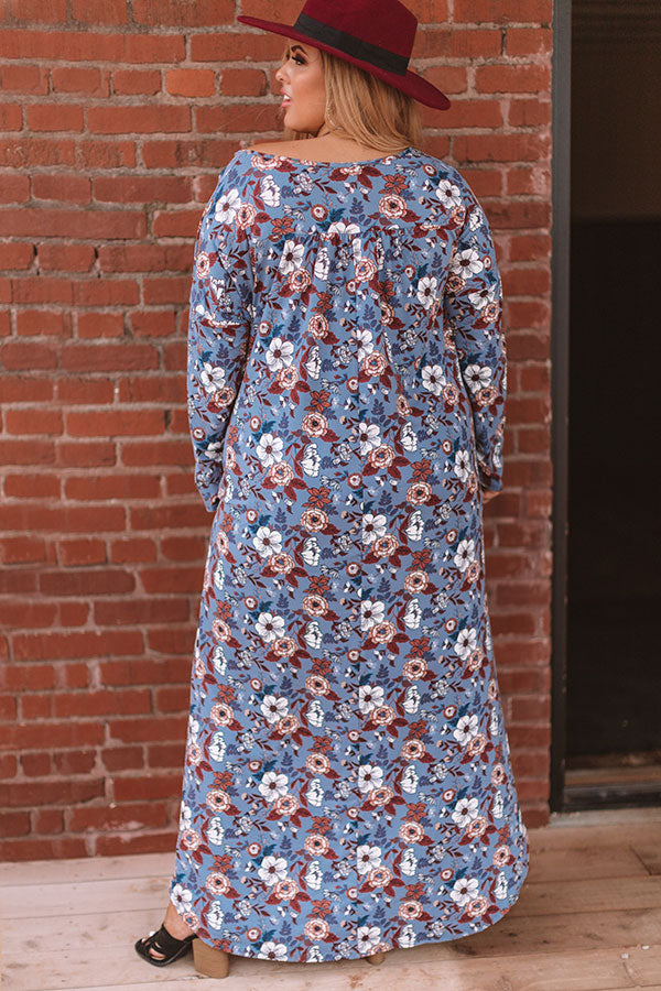 I got a pocket, "got a pocket full of posies!" This gorgeous blue dress features a gorgeous floral pattern, a v-cut neckline that can be worn off one shoulder, long sleeves, hidden side pockets, and an ultra comfy relaxed maxi-length silhouette with scooped sides and a rounded hemline that you can tie up if desired! Complete your look with black heels or neutral wedges and a few great accessories like a maroon faux suede hat or a crossbody, for an adorable transitional look that will carry you from season to season!