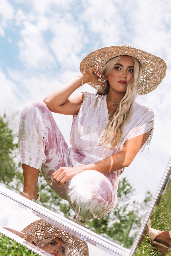 You will surely look "posh in paradise" when you wear this stunning jumpsuit featuring soft lightweight material patterned with blush/purple hued tie dye, a faux wrap bodice with a deep v-cut neckline, short loose cap sleeves with tie closures, a cinched waistline, accent side pockets, and a relaxed pants silhouette that falls into fitted ankle-length hemlines! We have styled these summer cuties with a woven block heel and hat, but you can also wear it with our white "Five Star Clear Strap Wedge" and our "Style Above The Rest Faux Leather Bucket Bag in White!" Measurements