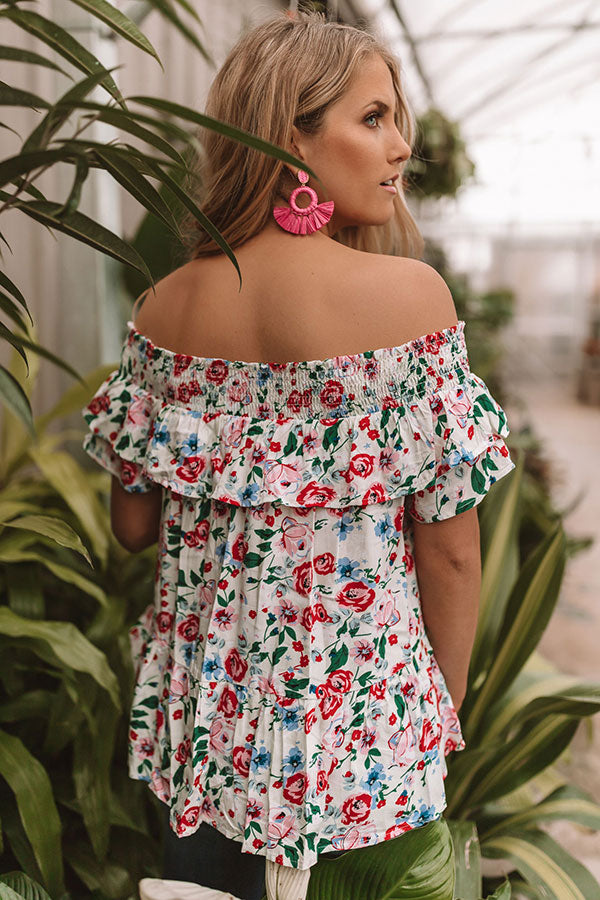This sweet floral printed off the shoulder top features a smocked, flounced neckline, short ruffled sleeves, a relaxed fit & is topped off with a cute peplum hem! Throw the "Resort Romance Off Shoulder Top" on with your favorite jeans for a boho chic look in no time! - Unlined, but not see through. - Hand wash cold. Hang to dry.
