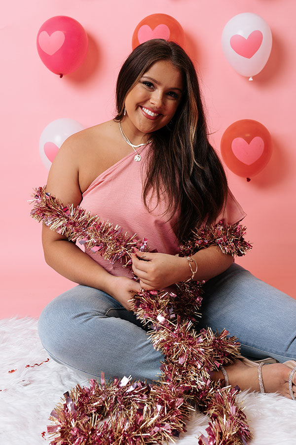 Plus Size - Enjoy those rooftop views in style with this elegant blush colored top featuring lightweight breezy material, a diagonal neckline with a single short bat wing sleeve, and a relaxed silhouette that falls into a straight hemline!