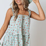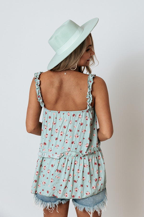 People are sure to envy your wardrobe when you arrive in our adorable mint hued 'Seaside Sunsets' tank featuring lightweight flowy material patterned with a pink hued floral print, a square neckline and upper back with ruffled sleeveless shoulder straps, and a relaxed silhouette that falls into a peplum bottom with a ruffled accent seam and an uneven hemline! Measurements