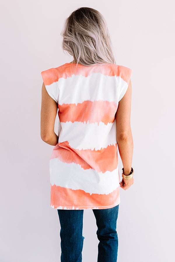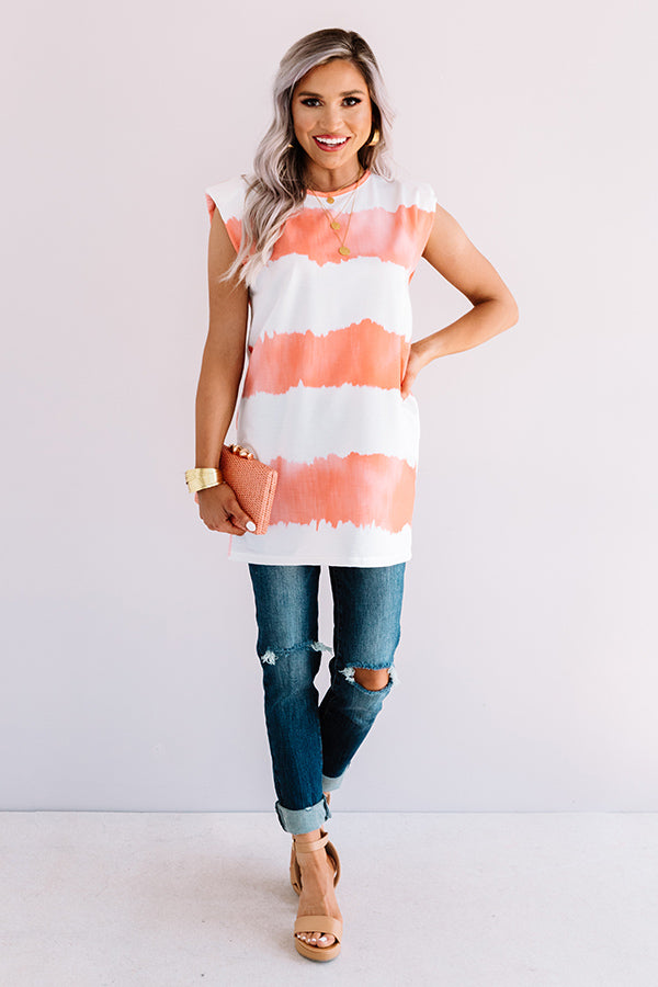 Diversify your wardrobe with our adorable "Serene Dreams" dress featuring lightweight material patterned with wide orange and white tie dye stripes, a high rounded neckline, wide 4-inch sleeveless shoulder straps, and a relaxed silhouette that falls into a straight tunic length hemline! We have styled this versatile piece with some distressed dark wash jeans, a matching clutch, and neutral heels, but you can also wear it with some frayed white shorts, "The Alaya Wedge in Coral," and our "Laying Out In Laguna Woven Hat!"