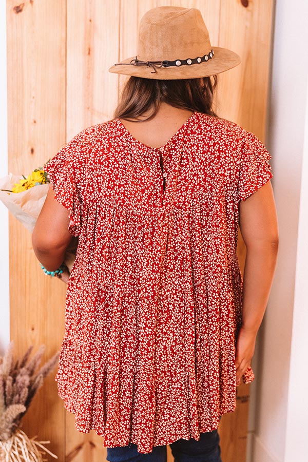 Plus Size - Transition to fall effortlessly with our adorable rust colored "Serious Delight" top featuring lightweight material patterned with a small white floral print, a high rounded neckline, short loose sleeves with ruffled trim detailing, a keyhole accented upper back with a button closure, and a relaxed tiered babydoll silhouette that falls into an uneven hemline! We have styled this fall cutie with some dark wash flares and a brown mule heel and wool hat, but you can also wear it with some frayed white shorts, "The Corey Faux Suede Bootie in Brown," and our "Chic Harmony Fringe Tote in Brown!" Measurements