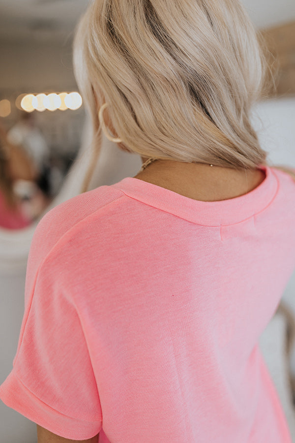 You are sure to feel euphoric when you wear this basic but comfy neon pink shift tee featuring soft lightweight and flowy material, a v-cut neckline, short loose sleeves with rolled cuffs, and a slouched silhouette that falls into a rounded hemline! Measurements