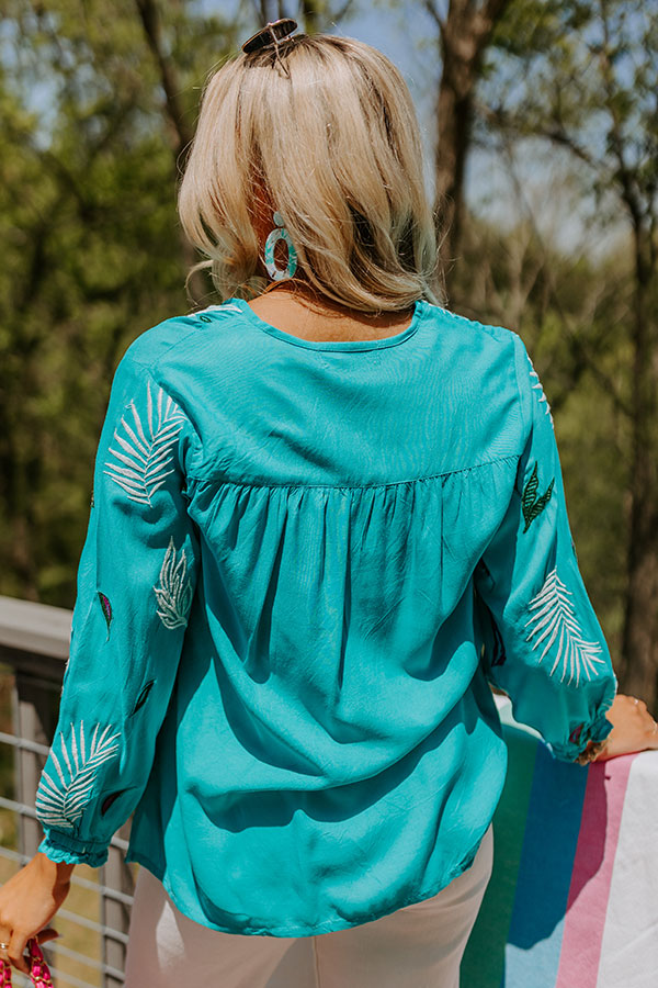 Believe us when we say you'll want to be spotted in this striking turquoise shift top featuring lightweight material patterned with beautiful embroidered detailing, a v-cut neckline with a tie closure, loose 3/4-length sleeves with subtle ruffle cuffs, and a relaxed silhouette that ends in a rounded hemline! on products