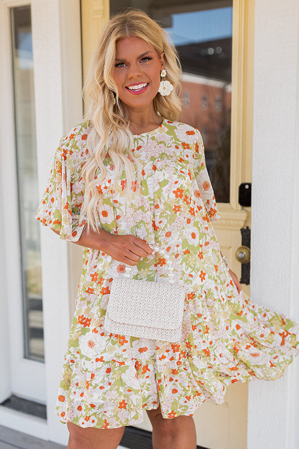 Stay amazing in this darling shift dress featuring lightweight material patterned with a lime, natural, and orange hued floral print, a rounded neckline, loose half sleeves, a keyhole accented upper back with a button closure, and a relaxed but flattering silhouette that falls into a straight lower-thigh length hemline! on products