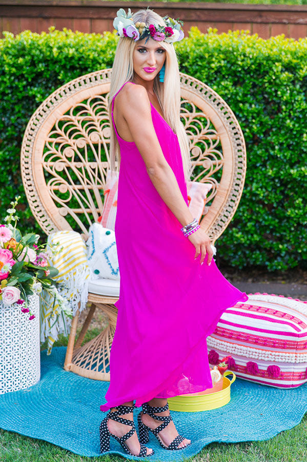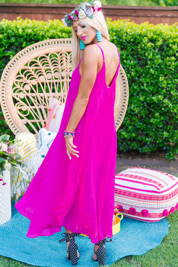 Sip mimosas at sunset in this fabulous fuchsia midi dress! This chic chiffon dress has a round neckline, thin adjustable straps, an ultra breezy poly silhouette & a rounded midi length hem that is perfect for showing off a sassy statement heel. Add a pop of color to your look with a turquoise statement earring, or a colorful bracelet stack! - Fully lined bodice. Partially lined skirt. - Machine wash cold. Hang to dry.