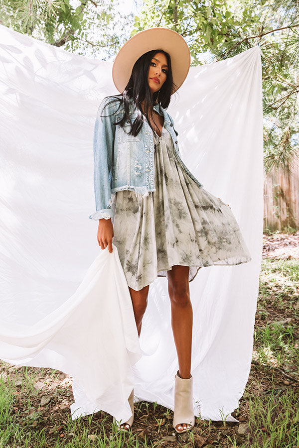 We have no doubt you will look photo worthy in our gorgeous "Taking Pictures" dress featuring lightweight breezy material patterned with sage colored tie dye, a deep v-cut neckline and upper back, 2-inch sleeveless shoulder straps with low cut sides, and an ultra relaxed babydoll silhouette that falls into an uneven lower-thigh length hemline! This cutie styles perfectly layered under a jean jacket with a neutral peep toe bootie and wool hat, but you can also wear it with "The Bowen Wedge in Brown" and our "Chic Harmony Fringe Tote in Brown!" Measurements
