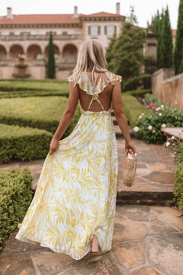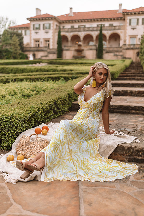 Create your own sunshine in this bombshell wrap maxi! The deep v-neckline and flowy skirt only adds to this dresses beauty, and the yellow palm leaf pattern and ruffle details are guaranteed to have you feeling vibrant this summer! Measurements