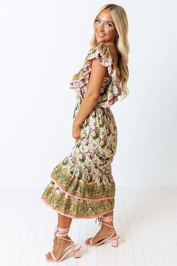 Show up and show out in our beautiful 'Toasting In Tuscany' maxi dress featuring lightweight material patterned with an intricate green, pink, and natural hued floral print, a button up bodice with a scooped neckline, ruffled cap sleeves that continue down the sides, a cinched waistline, and a relaxed skirt silhouette that cascades into a straight ankle-length hemline!