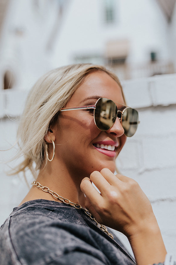 Enter into vacay mode when you slip on these trendy sunnies featuring gold aviator frames and pink tinted lenses!