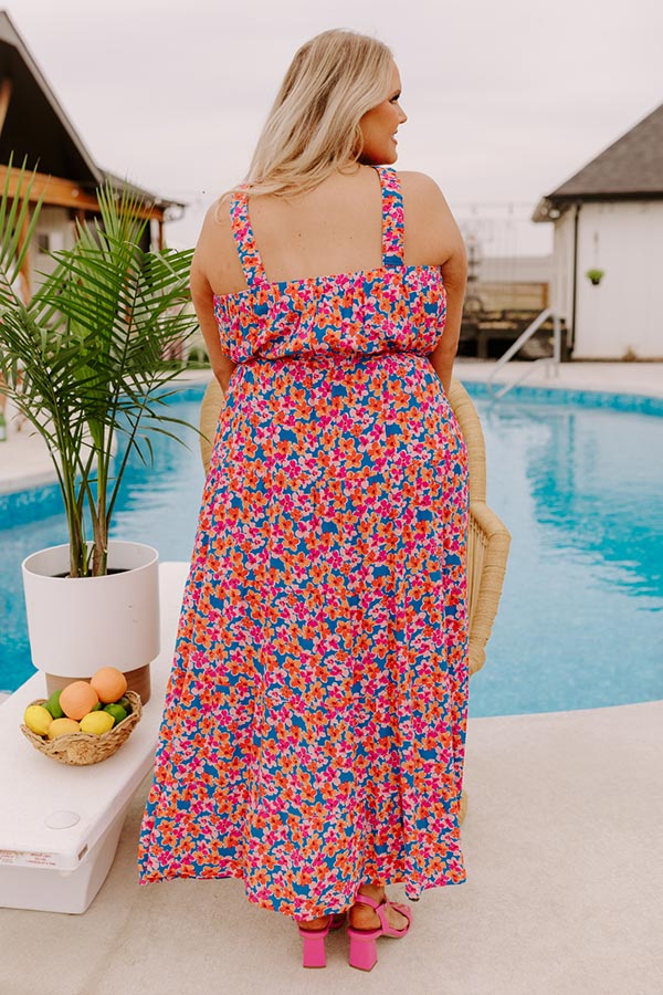 - This trendy dress is a breezy option for a sunny day! - Lightweight, unlined, blue hued material with a pink and orange hued floral material - A stretchy, high cut elastic neckline with 1.5-inch elastic straps - An elastic back and waistline - Hidden side pockets - A flowy silhouette that ends in straight ankle length hemlines